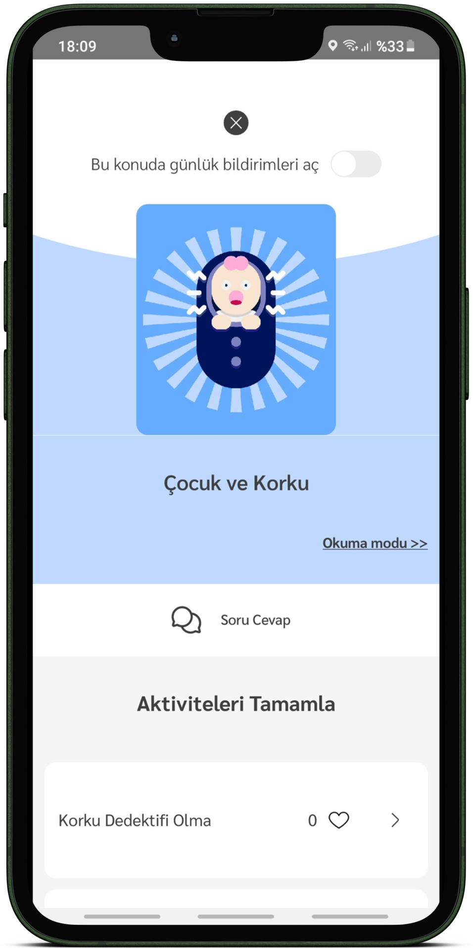Uzman psikologların hazırladığı içerikler ve bu içeriklere bağlı, çocuğunuzla olan ilişkinizde farkındalığınızı artıracak günlük hap bilgiler, hatırlatma içeren bildirim paketleri.
